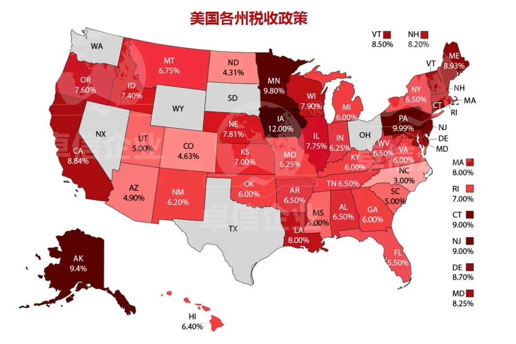 綜合稅率較低的州為:懷俄明州、華盛頓州、內(nèi)華達州、科羅拉多州、俄勒岡州、得克薩斯州和特拉華州