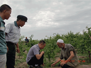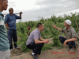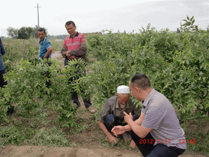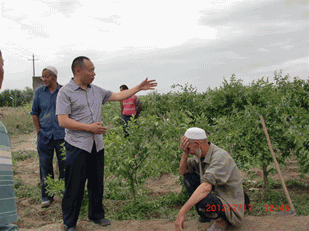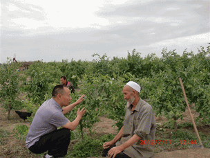 2012年7月17日,公司董事長兼總經(jīng)理李智強(qiáng)到本公司產(chǎn)品土壤改良劑“施地佳”試驗(yàn)地——新疆新和縣紅棗種植基地考察并和大棗種植戶的維族老人屈膝交談。