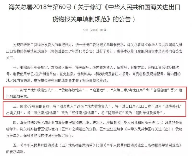 我們可以看到,在第60號公告中,最引人關注的是第二條新增“境外收發(fā)貨人”、“貨物存放地點”、“啟運港”、“入境口岸/離境口岸”和“自報自繳”等5個欄目的填制要求。