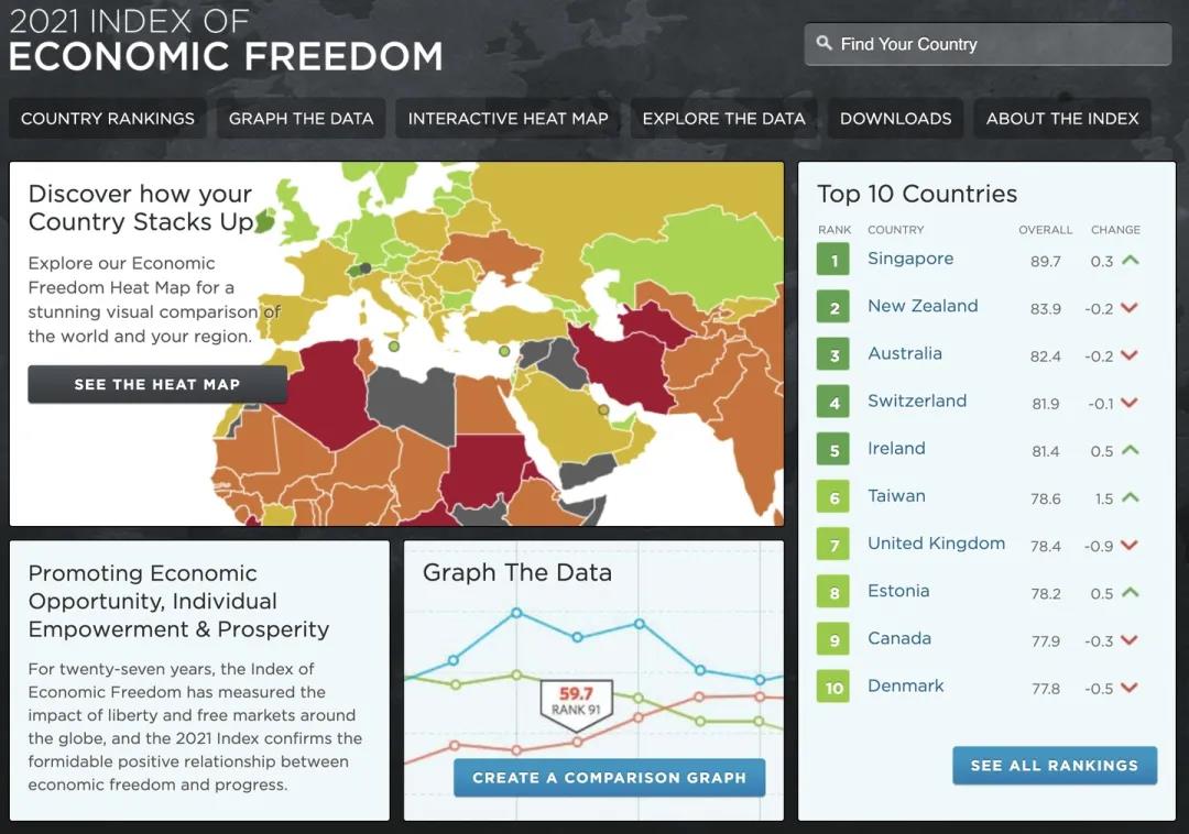 在今年的全球權(quán)威的經(jīng)濟自由度評價指標中,由《華爾街日報》和美國傳統(tǒng)基金會發(fā)布的2021年度報告中,新加坡成為全球最自由經(jīng)濟體。在加拿大菲沙研究所最新發(fā)表的《世界經(jīng)濟自由度2020年度報告》中,新加坡排名第二。